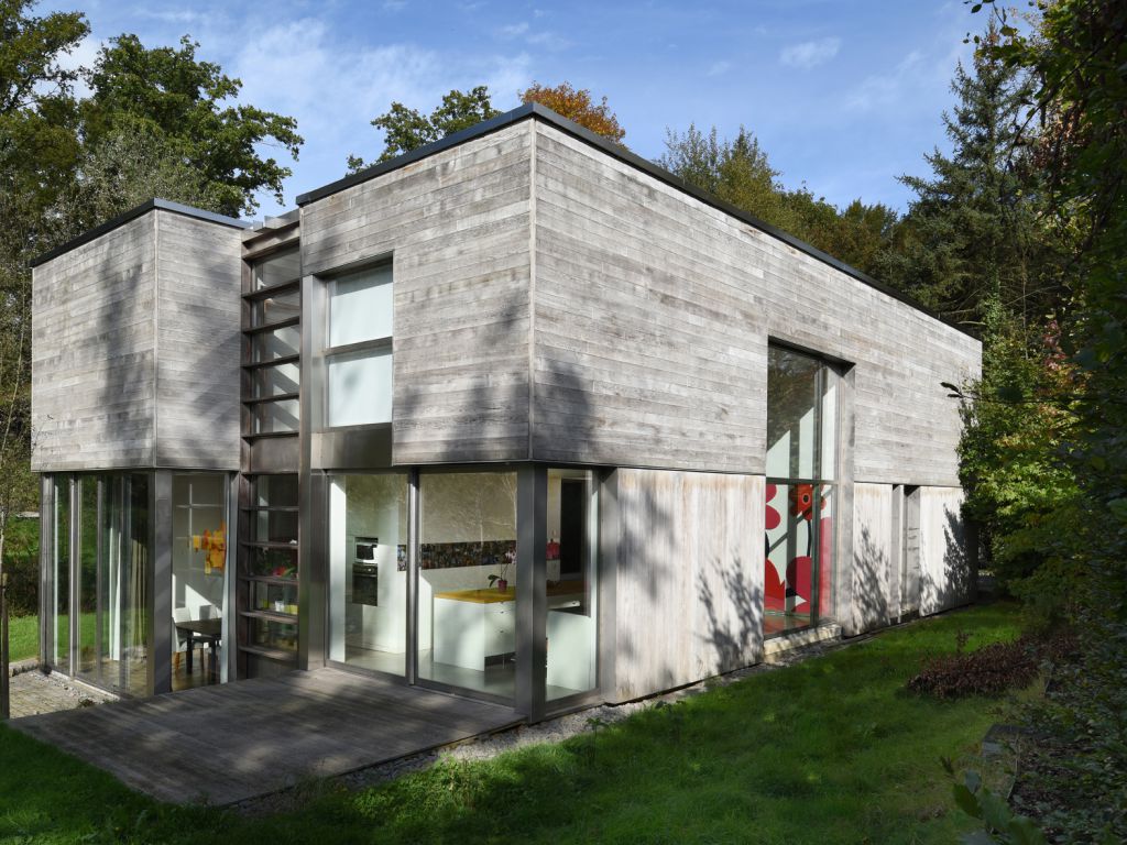 Cette maison, entièrement réalisée avec des matériaux écologiques, se développe, entre la rue et le ruisseau, en trois strates linéaires parallèles à ces limites.